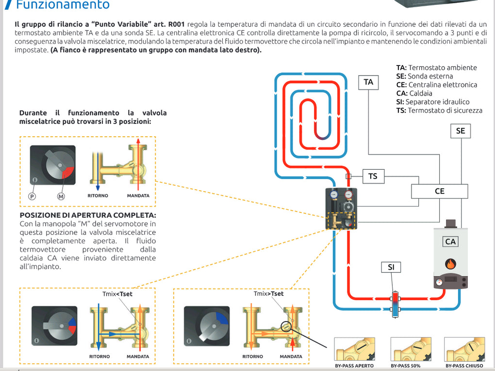 Il gruppo R001 regola la temperatura di mandata del circuito secondario in base ai dati rilevati dal termostato ambiente (TA) e dalla sonda SE.