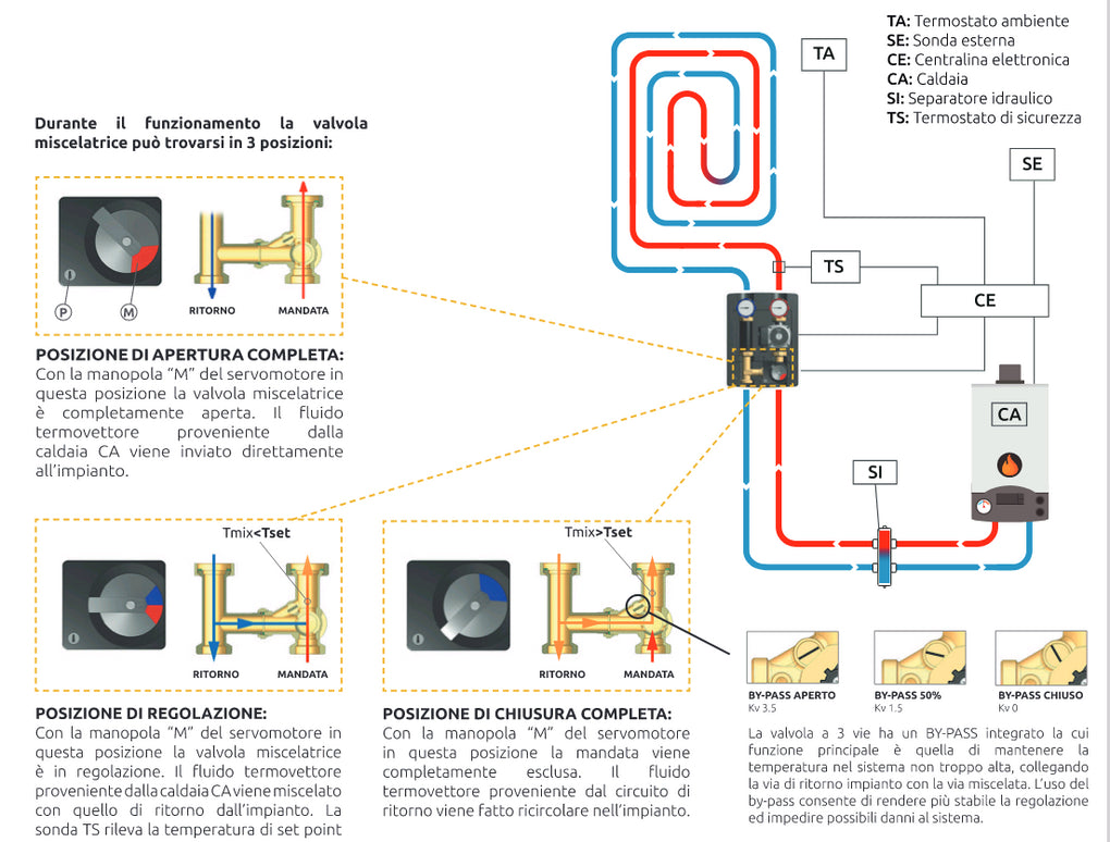 La centralina elettronica (CE) controlla la pompa di ricircolo, il servocomando a 3 punti e la valvola miscelatrice, modulando la temperatura del fluido per garantire il massimo comfort e mantenere le condizioni ambientali ottimali.