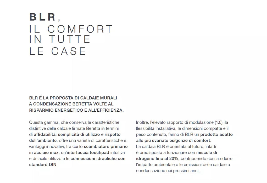 Grazie al design compatto, al peso contenuto e alla predisposizione al funzionamento con miscele di idrogeno fino al 20%, la BLR 30C è una soluzione moderna, sostenibile e flessibile, perfetta sia per nuove installazioni che per la sostituzione di vecchie caldaie.