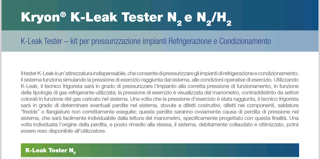 Il K-LEAK Tester è un’attrezzatura professionale e indispensabile per la ricerca delle perdite e la pressurizzazione degli impianti di refrigerazione e condizionamento.